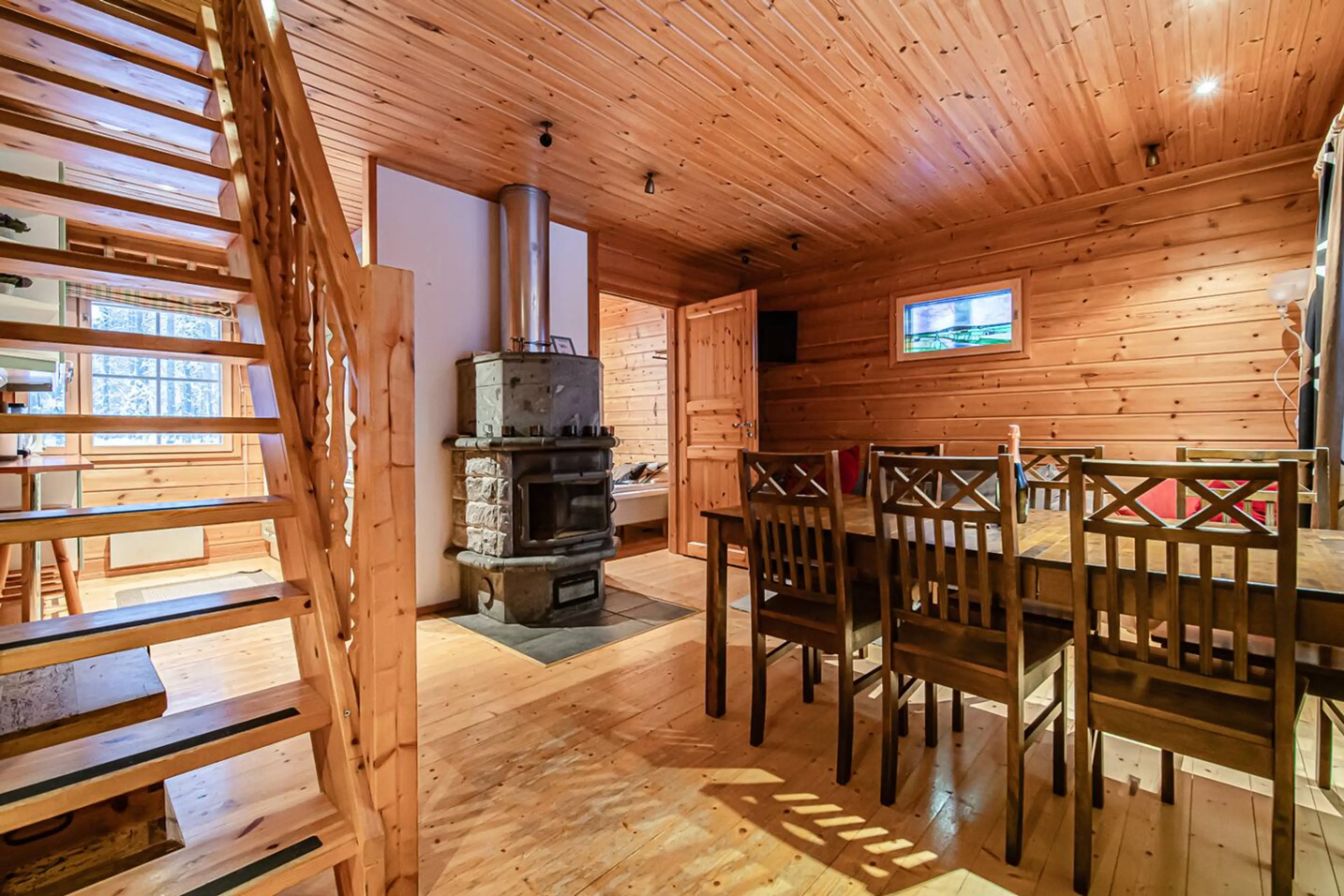 Snow Lodge Levi Center 8B by Aavalevi Located in Levi, within easy walking distance of the village center yet tucked away in a peaceful setting, this semi-detached log cabin offers a perfect balance of comfort, privacy, and tranquility. The 118 m² property comfortably accommodates 6+2 guests. On t...