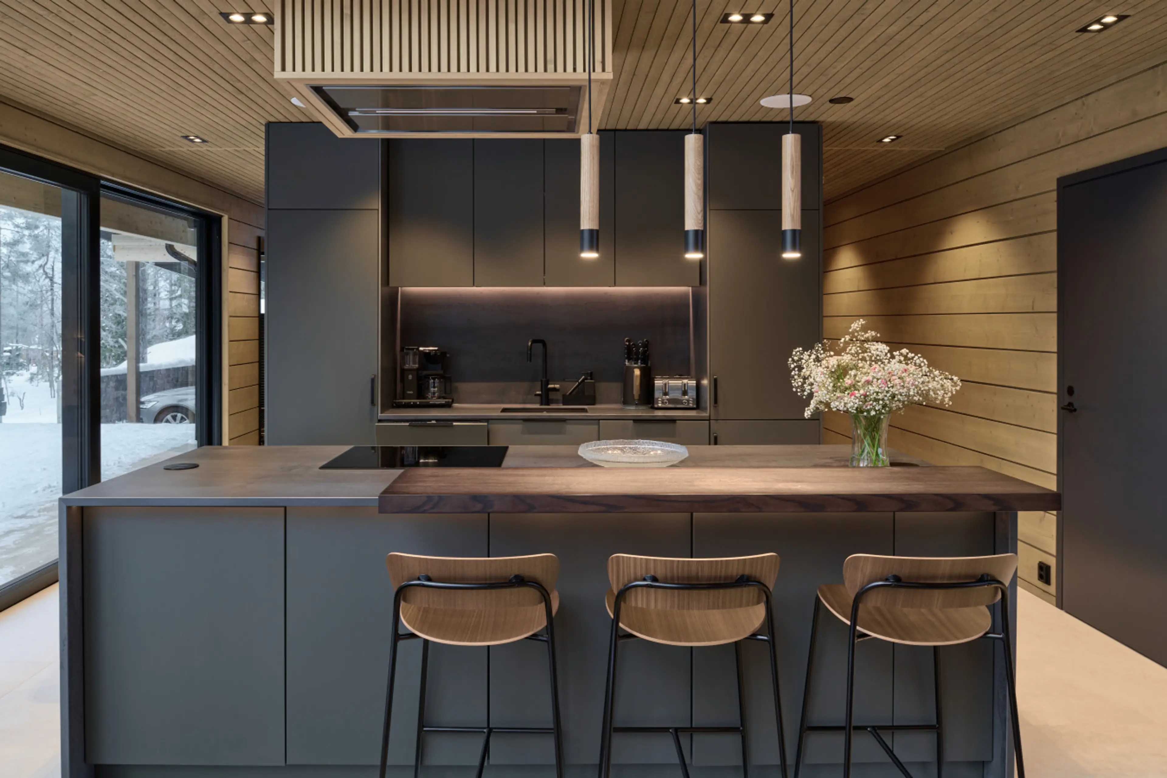 Kaira Chalet by Aavalevi Luxury and serenity in the heart of Ylläs, where modern elegance blends seamlessly with northern nature. Chalets expansive windows flood the space with natural light and frame breathtaking views of the surrounding fell landscape. The living room exudes a cozy atmosphere wi...